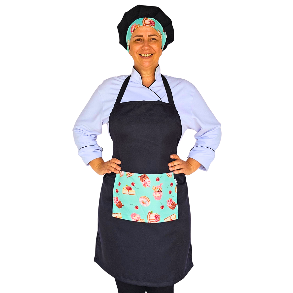A touca garante ótima cobertura dos cabelos, ajudando a manter a higiene nos preparos, enquanto o avental protege a roupa de respingos de gordura, molhos e farinhas. Ambos possuem modelagem confortável, que se adapta bem a diferentes tipos de corpo e rotinas de trabalho.