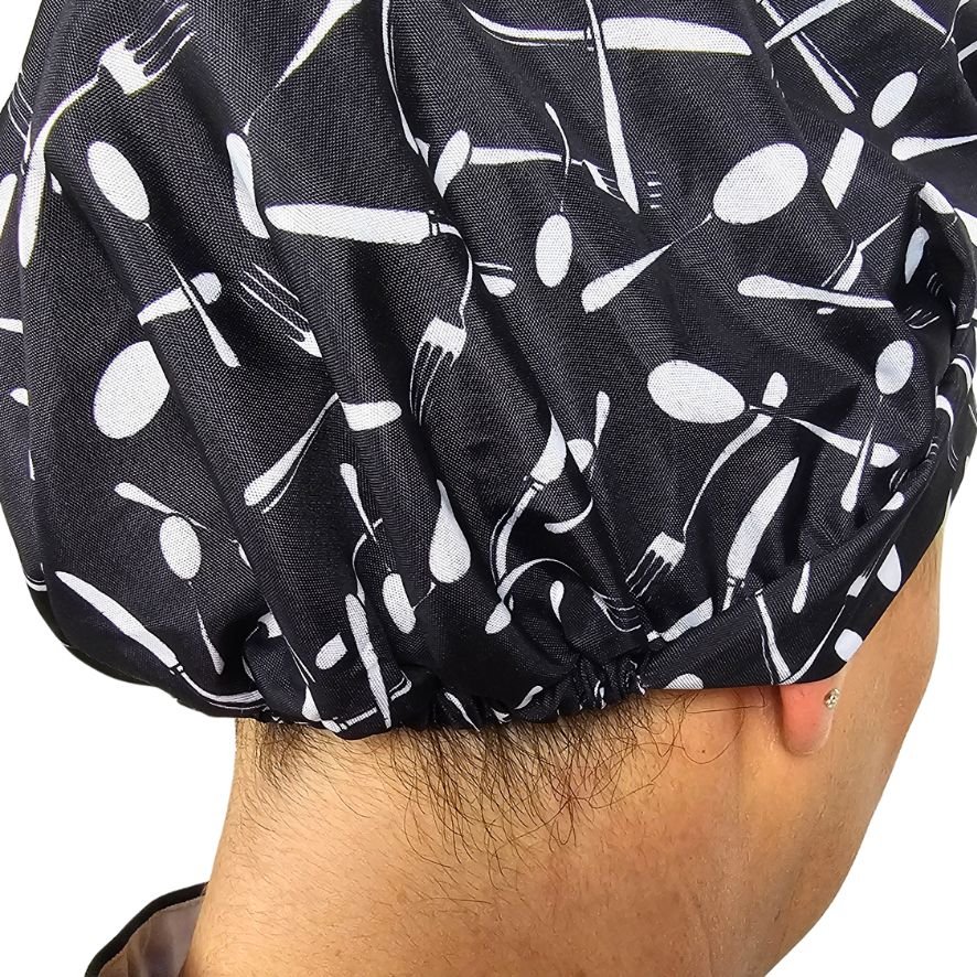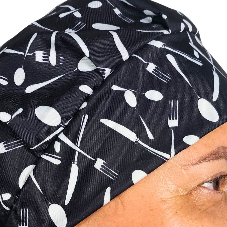 A Touca Conffort Estampada Talheres da Lakucca traz uma estampa moderna e cheia de personalidade, perfeita para quem gosta de se destacar na cozinha. Seu fundo preto com talheres em contraste garante um visual criativo e profissional ao mesmo tempo.